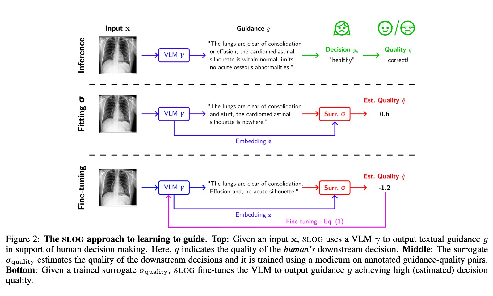 There is increasing interest in developing AIs for assisting human decision-making in high-stakes tasks, such as medical diagnosis, for the purpose of improving decision quality and reducing cognitive strain. Mainstream approaches team up an expert with a machine learning model to which safer decisions are offloaded, thus letting the former focus on cases that demand their attention. his separation of responsibilities setup, however, is inadequate for high-stakes scenarios. On the one hand, the expert may end up over-relying on the machine’s decisions due to anchoring bias, thus losing the human oversight that is increasingly being required by regulatory agencies to ensure trustworthy AI. On the other hand, the expert is left entirely unassisted on the (typically hardest) decisions on which the model abstained. As a remedy, we introduce learning to guide (LTG), an alternative framework in which - rather than taking control from the human expert - the machine provides guidance useful for decision making, and the human is entirely responsible for coming up with a decision. In order to ensure guidance is interpretable} and task-specific, we develop SLOG, an approach for turning any vision-language model into a capable generator of textual guidance by leveraging a modicum of human feedback. Our empirical evaluation highlights the promise of SLOG on a challenging, real-world medical diagnosis task.