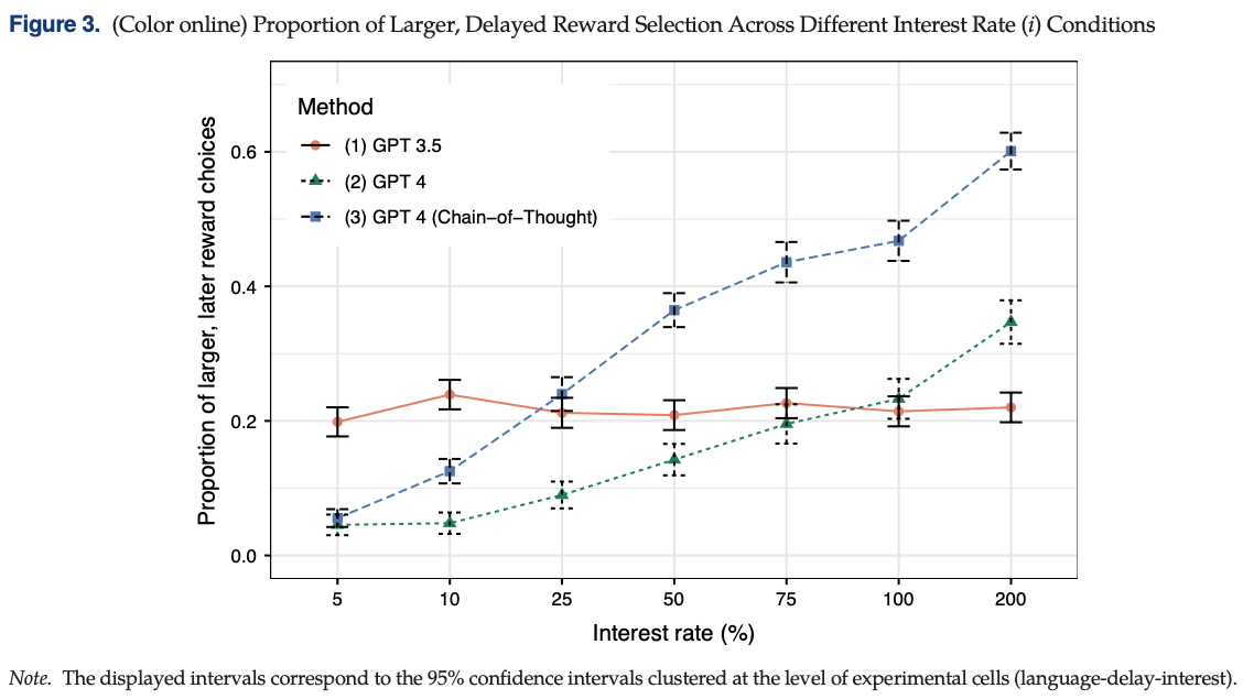 We explore the viability of large language models (LLMs), specifically OpenAI’s GPT-3.5 and GPT-4, in emulating human survey respondents and eliciting preferences, with a focus on intertemporal choices. Leveraging the extensive literature on intertemporal discounting for benchmarking, we examine responses from LLMs across various languages and compare them with human responses, exploring preferences between smaller, sooner and larger, later rewards. Our findings reveal that both generative pretrained transformer (GPT) models demonstrate less patience than humans, with GPT-3.5 exhibiting a lexicographic preference for earlier rewards unlike human decision makers. Although GPT-4 does not display lexicographic preferences, its measured discount rates are still considerably larger than those found in humans. Interestingly, GPT models show greater patience in languages with weak future tense references, such as German and Mandarin, aligning with the existing literature that suggests a correlation between language structure and intertemporal preferences. We demonstrate how prompting GPT to explain its decisions, a procedure we term “chain-of-thought conjoint,” can mitigate, but does not eliminate, discrepancies between LLM and human responses. Although directly eliciting preferences using LLMs may yield misleading results, combining chain-of-thought conjoint with topic modeling aids in hypothesis generation, enabling researchers to explore the underpinnings of preferences. Chain-of-thought conjoint provides a structured framework for marketers to use LLMs to identify potential attributes or factors that can explain preference heterogeneity across different customers and contexts.