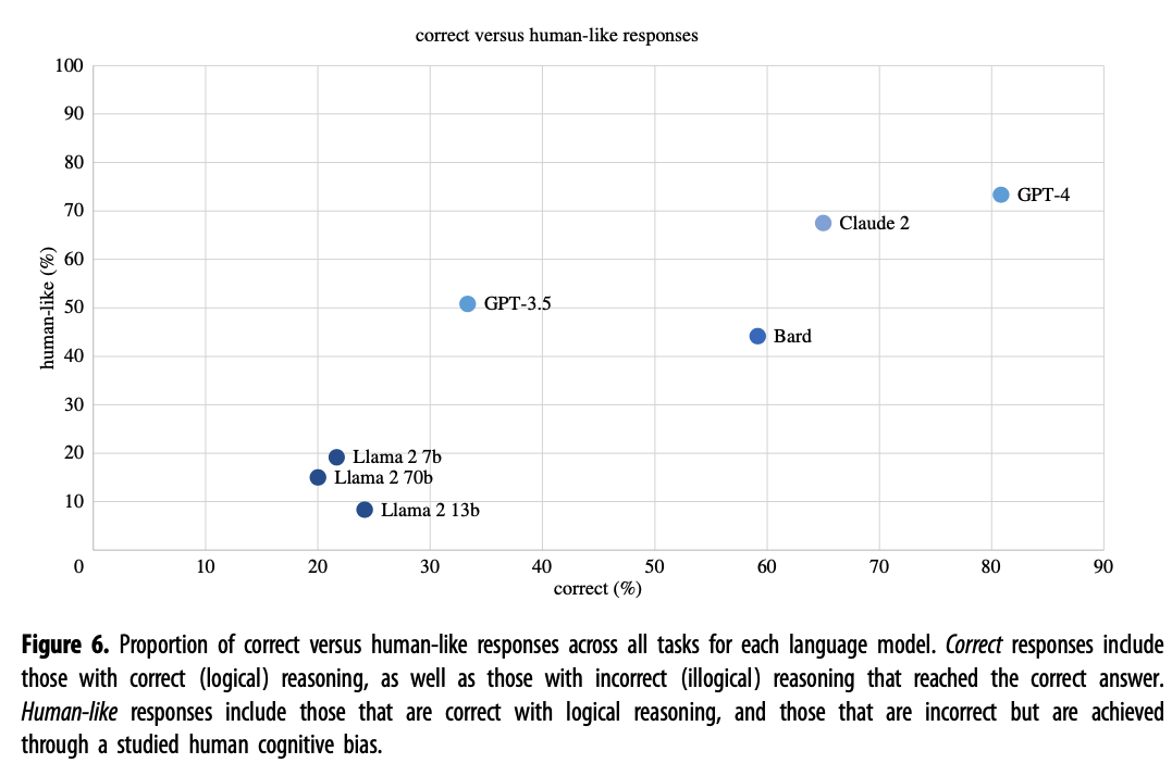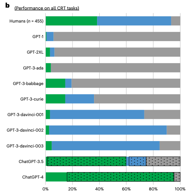 Hagendorff, T., Fabi, S., & Kosinski, M. (2023). Human-like intuitive behavior and reasoning biases emerged in large language models but disappeared in ChatGPT. Nature Computational Science, 3(10), 833–838. https://doi.org/10.1038/s43588-023-00527-x