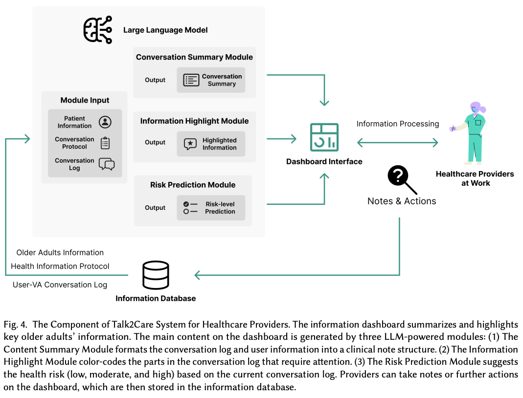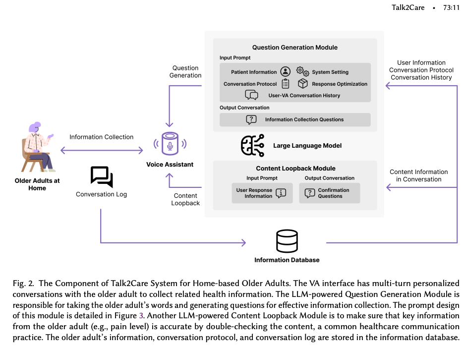 Yang, Z., Xu, X., Yao, B., Rogers, E., Zhang, S., Intille, S., Shara, N., Gao, G. G., & Wang, D. (2024). Talk2Care: An LLM-based Voice Assistant for Communication between Healthcare Providers and Older Adults. Proceedings of the ACM on Interactive, Mobile, Wearable and Ubiquitous Technologies, 8(2), 1–35. https://doi.org/10.1145/3659625